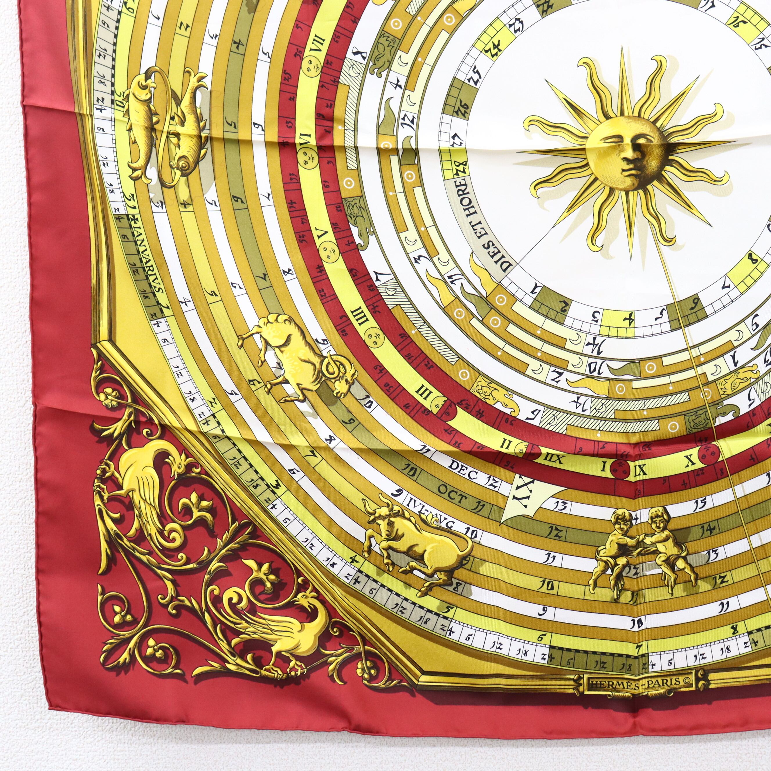 HERMES エルメス カレ90 DIES ET HORE 占星術 シルクスカーフ 大判ショール ボルドー系 21-2695